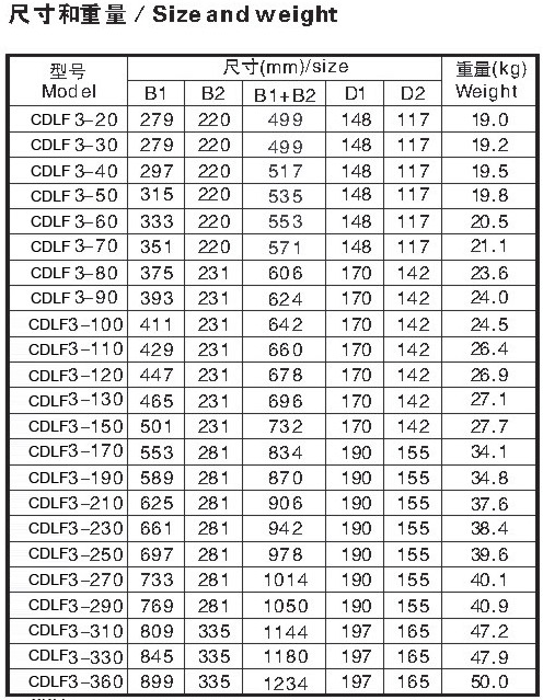 CDLF為安裝標準電機的非自吸立式多級離心泵,電機軸通過泵頭用聯軸器直接與泵軸聯接,拉桿螺栓將耐壓筒、過流部件固定在泵頭和進出水段之間,泵進出水口在泵底同一直線上;本泵可根據需要配置智能保護器,對泵干轉\缺相\過載等進行有效保護。